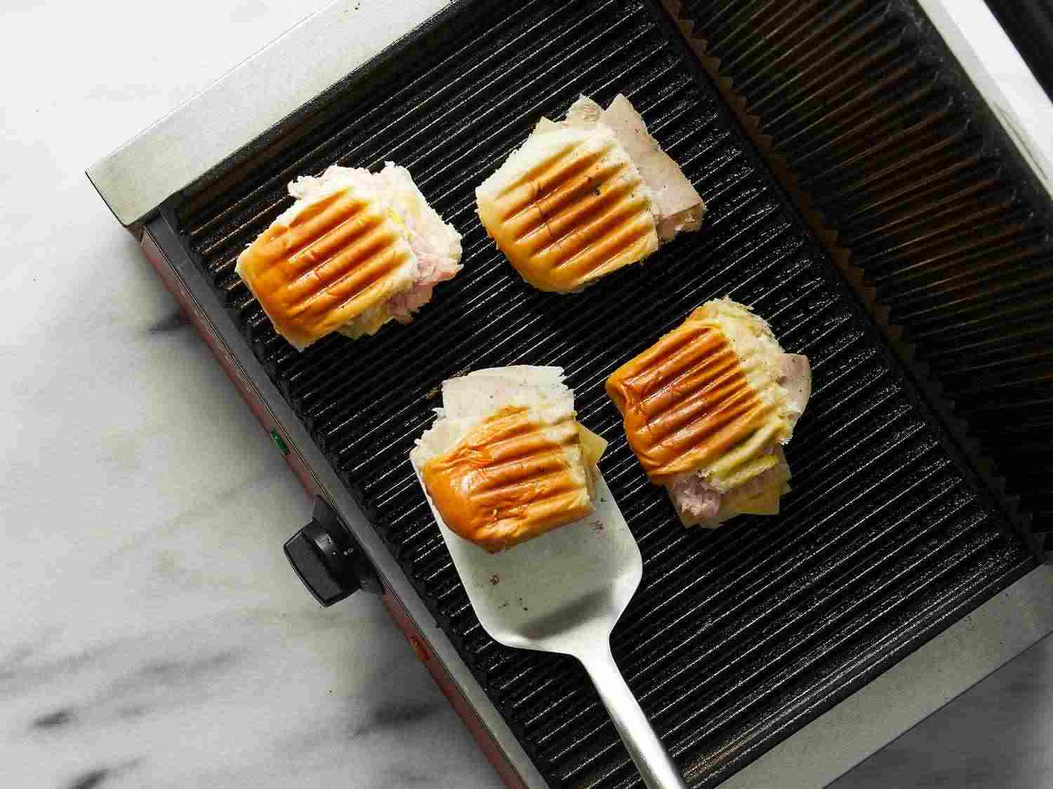 - Step 3:Press each sandwich in a sandwich press heated to medium-high heat. If a sandwich press is not available, use a large skillet over medium-high heat, and press the sandwiches down using a sturdy plate or skillet. Some indoor grills may be good for this also. Cook for 5 to 8 minutes, keeping sandwiches pressed. If using a skillet, you may want to flip them once for even browning. Dotdash Meredith Food Studios